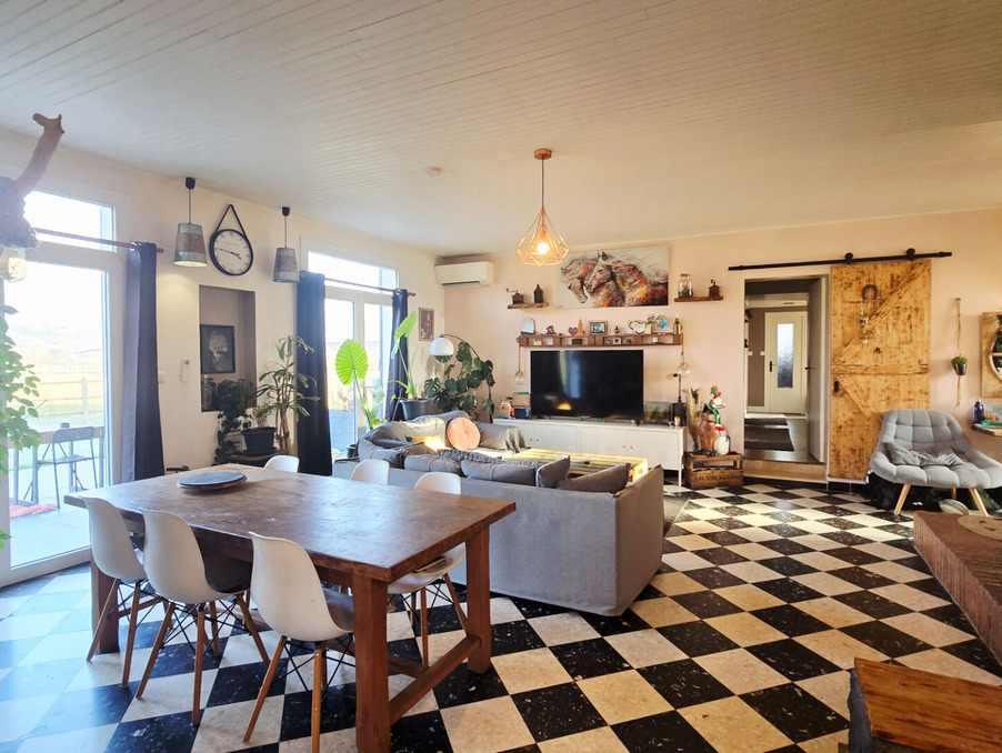 Dès l'entrée, vous découvrirez une belle pièce de vie lumineuse composée d'un salon chaleureux avec cheminée insert, ouverte sur une cuisine équipée conviviale.